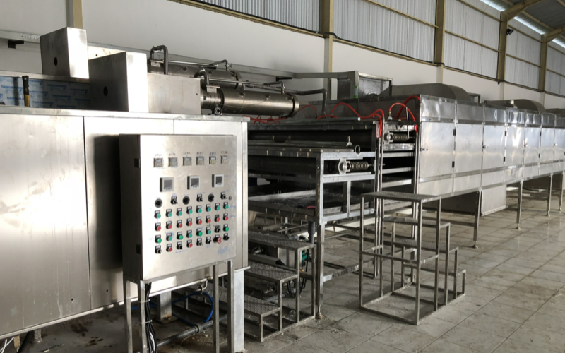 網(wǎng)帶將擠出的粉絲帶入預干燥機,對粉絲表面進行干燥,使其不粘連;