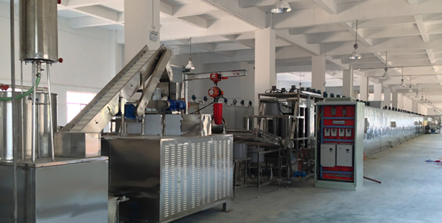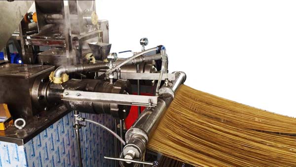 本生產(chǎn)線采用擠壓非膨化技術(shù),通過高壓高溫使雜糧淀粉糊化并形成條狀;本設(shè)備適用于多種雜糧谷物,針對不同糧食的特性,只需調(diào)整相關(guān)的PLC參數(shù),即可實(shí)現(xiàn)不同原料雜糧面條的生產(chǎn)。