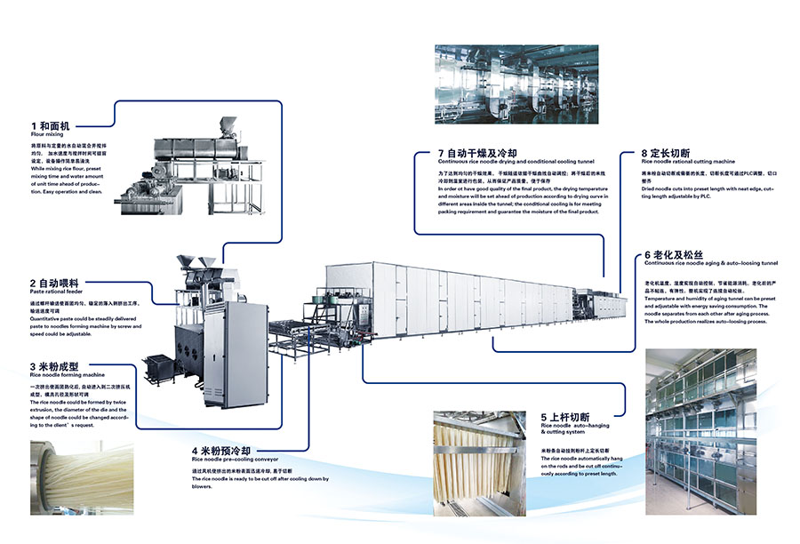 該生產(chǎn)線可用于生產(chǎn)江西米粉、桂林米粉等直條米粉用,產(chǎn)品直徑從1.0mm到1.6mm可調(diào),生產(chǎn)出的直條米粉質(zhì)地緊密、外形均勻、條型整齊、口感滑爽Q彈,可煮可炒。生產(chǎn)線設(shè)計(jì)科學(xué)、工藝合理、操作簡(jiǎn)單、使用人工少、故障率低、自動(dòng)化程度高,可實(shí)現(xiàn)生產(chǎn)過程標(biāo)準(zhǔn)化。除可生產(chǎn)普通米線外,本生產(chǎn)線還可用于紅米、黑米等其他復(fù)配原料的生產(chǎn),為廣大消費(fèi)者提供更多的選擇。